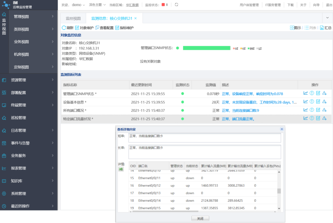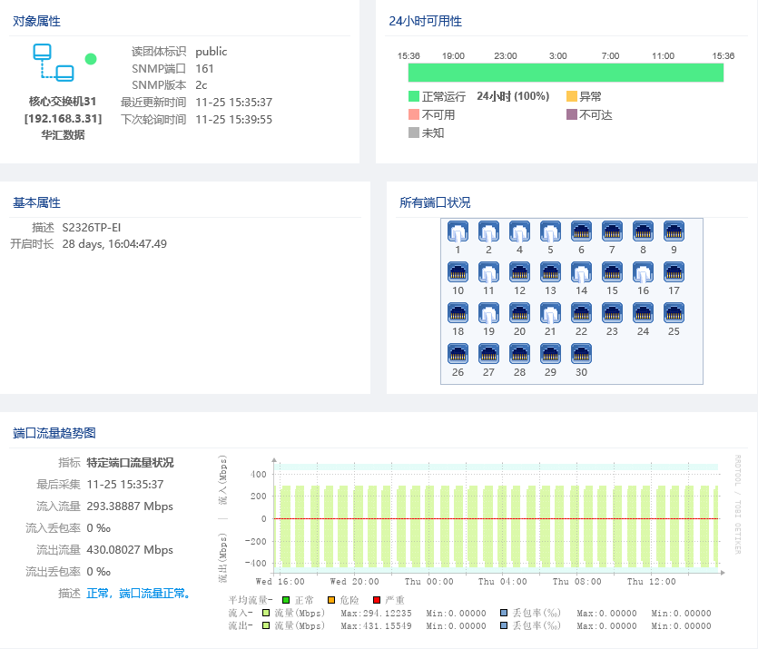 系统的网络监控是基于SNMP 管理协议开发的跨厂商、跨平台的通用网络管理模块,能全面管理支持SNMP 协议各个网络设备厂商的产品,监控设备类型包括交换机、路由器、防火墙、负载均衡等设备,监控内容包括设备可用性(ping)、端口流量、端口使用率、内存使用率、CPU使用率等。