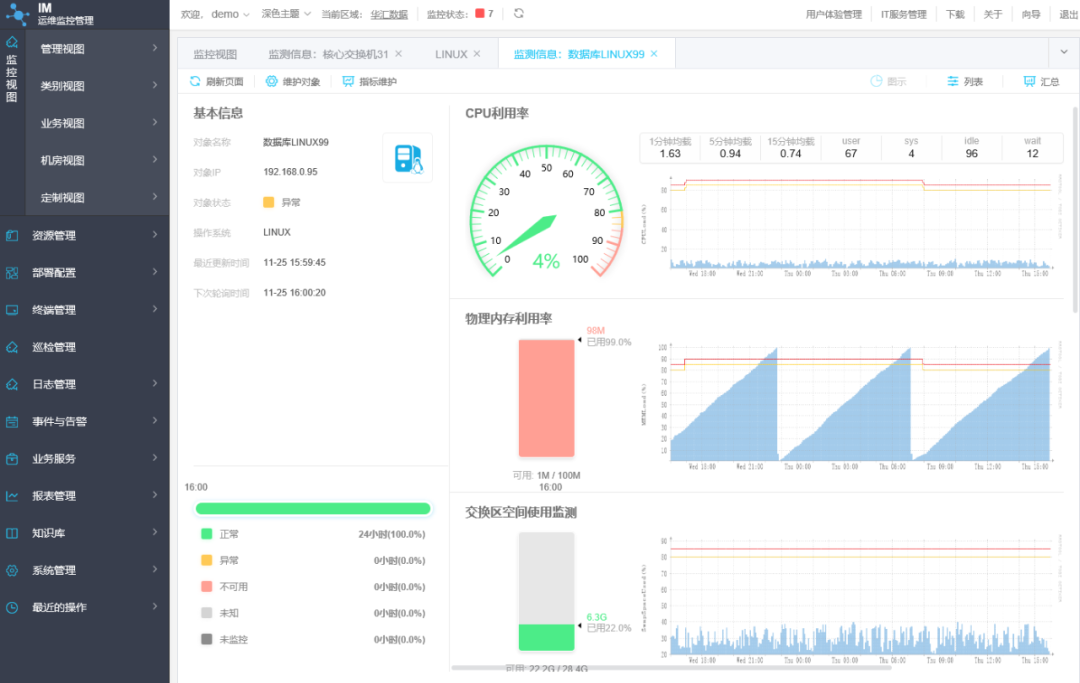 系统的服务器监控从多个方面对服务器硬件资源和操作系统进行监控管理,监控内容包括非法登录监测、存储空间监测、CPU负载监测、物理内存监测、交换区空间监测、IO负载监测、集群状态监测、指定进程监测和系统日志监测等。支持IBM AIX、HP-UX、Solaris、Windows、Linux、Red Hat、CentOS等多种操作系统及IBM、HP、Lenovo等服务器设备。