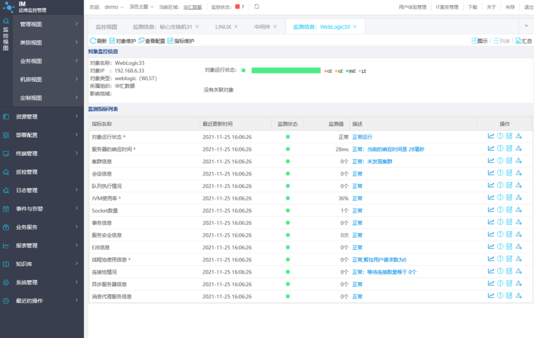 在企业业务信息化之后,企业业务依赖于各种应用系统,应用系统又依赖于各种IT资源。当IT资源出现故障或性能下降时,会导致应用宕机或性能下降,进而影响企业业务产出。资源监控就是对那些可能影响IT资源服务能力的各种技术性能参数进行全面监控,以便提前发现问题隐患并预警,帮助企业将故障消灭于萌芽状态之中。